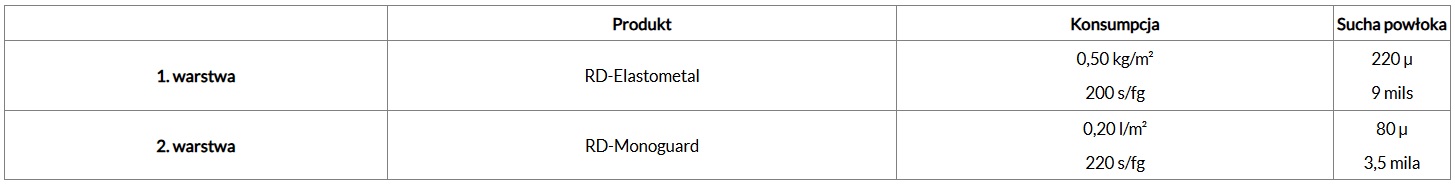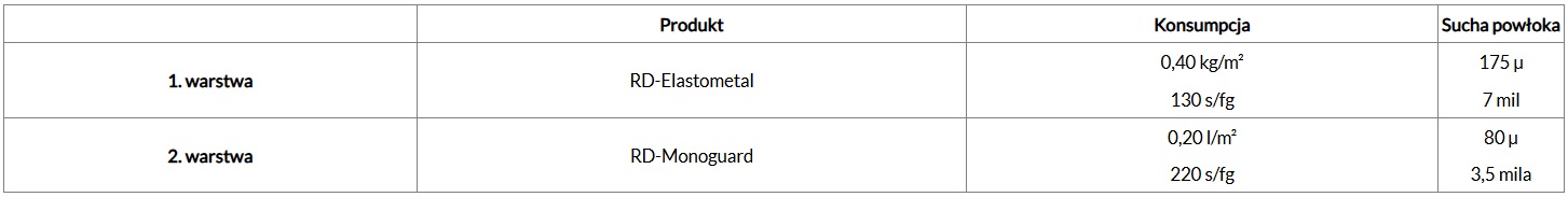 RD-Elastometal i RD-Monoguard — stosowane oddzielnie lub w systemie — skutecznie rozwiązują kluczowe problemy ochrony antykorozyjnej i stanowią bazę naszych sprawdzonych rozwiązań. Zapewniają długotrwałą ochronę stali, a zgodnie z normą ISO 12944 gwarantują co najmniej 15 lat bezobsługowej eksploatacji w środowisku przemysłowym lub morskim C5 oraz ponad 25 lat w środowiskach C4.