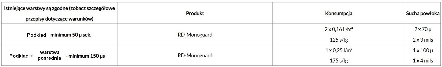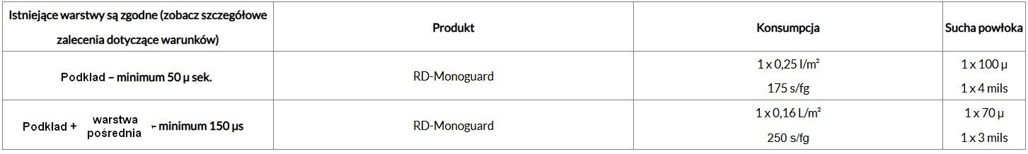 RD-Monoguard łączy w sobie wszystkie właściwości powłok nowej generacji: jest produktem jednoskładnikowym, na bazie wody, o bardzo niskiej zawartości lotnych związków organicznych (LZO), schnie bardzo szybko, a jednocześnie zapewnia piękne, półpołyskowe wykończenie przypominające emalię. Posiada wyjątkowe właściwości antykorozyjne! Tego typu powłoki wykorzystuje się również w innych gałęziach przemysłu, zwłaszcza przy renowacji metalowych mostów, np. mostu Øresund, jednego z najdłuższych w Europie, łączącego Danię ze Szwecją.