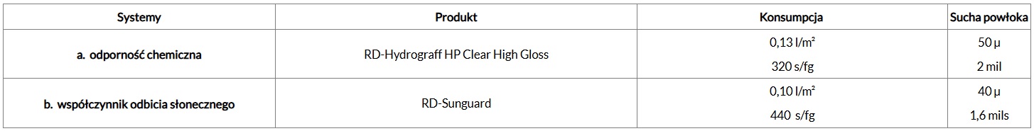 a. Odporność chemiczna i środowiskowa – możliwość uzyskania wysokiej odporności na paliwa, chemikalia, zanieczyszczenia oraz inne czynniki agresywne. Lakierowanie punktowe zaleca się stosować wyłącznie na powierzchniach, które mogą mieć bezpośredni kontakt z tego typu substancjami.