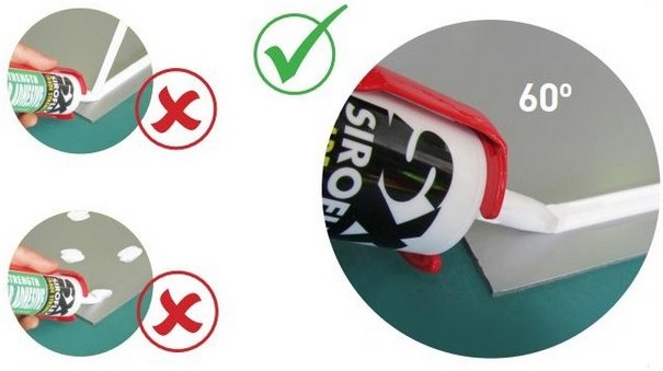 - Nakładanie kleju pistoletem powinno się odbywać w ten sposób, że dysza ustawiona jest pod kątem 60º do podłoża, a rowek w kształcie litery „V” skierowany ku górze.