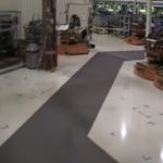 Dzień po szpachlowaniu, przed rozłożeniem taśm miedzianych posadzkę należy przeszlifować celem zmatowienia i poprawy przyczepności kolejnej warstwy. Po odpyleniu posadzki rozkładamy taśmy miedziane. Taśma powinna stworzyć siatkę na powierzchni całej hali. Odstępy między taśmami nie powinny być zbyt duże. Na poniższym zdjęciu taśmy przyklejono w odstępach ok trzech metrów.