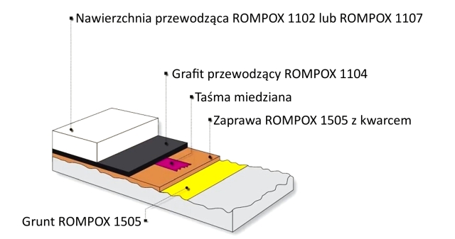 Po 24 godzinach od aplikacji grafitu przewodzącego można przystąpić do nakładania nawierzchni przewodzącej. Czas stosowania produktów po wymieszaniu obu składników to 20 do 30 minut przy temperaturze 20oC. Rompox 1102 oraz 1107 to przewodzące żywice samopoziomujące przeznaczone do aplikacji raklami. Nawierzchnię należy nanieść na posadzkę i bardzo dokładnie rozprowadzić przy użyciu odpowiednich narzędzi a następnie odpowietrzyć przy pomocy wałka z kolcami. Aplikacja grubej warstwy zapewnia bezpieczeństwo taśmy miedzianej znajdującej się pod powierzchnią.