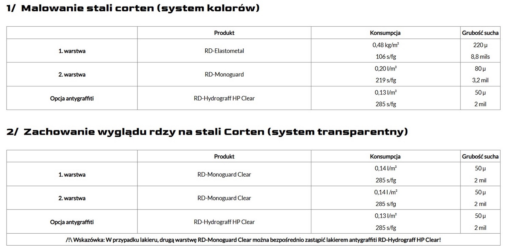 RD Coatings oferuje dwa systemy dopasowane do stanu stali Corten i oczekiwanego wykończenia. Każdy można nałożyć szybko — zaledwie w dwóch warstwach. Dzięki wodnej bazie produkty mają bardzo niską zawartość LZO, są niepalne, praktycznie bezwonne i wyjątkowo łatwe w aplikacji, nie powodując żadnych uciążliwości.