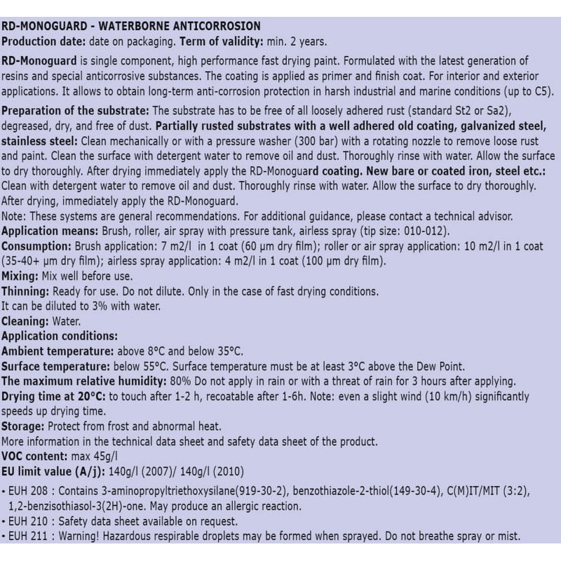 Monoguard is a highly durable, water-based, quick-drying 2-in-1 anti-corrosion paint for direct application on rust, steel, zinc, and more, even in harsh industrial conditions. The paint is based on a new generation of acrylic resins and special anti-corrosive substances. It creates highly durable protection against temperature changes and external conditions.