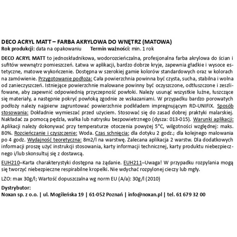 Deco Acryl is a top-quality, professional acrylic interior paint. What sets Deco Acryl apart from the competition is its exceptionally aesthetic and even finish. It contains a high percentage of high-quality pigments, which means it provides excellent coverage, does not fade or drip, is easy to apply, and leaves a smooth layer without stains or streaks.