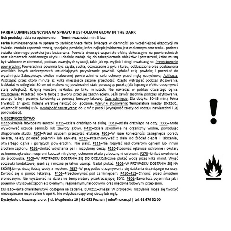 Spray luminescencyjny to szybkoschnąca farba świecąca w ciemności po wcześniejszej ekspozycji na świetle. Spray zapewnia trwałą powłokę, która najlepiej widoczna jest w ciemnym otoczeniu, w nocy - podczas światła dziennego powłoka ma delikatny seledynowo-biały kolor.
