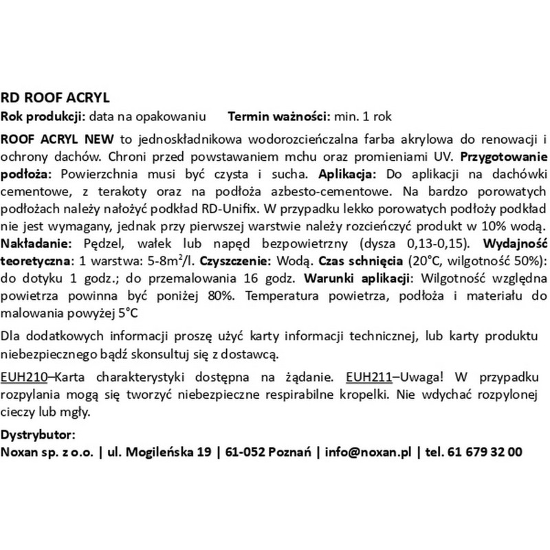 Roof Acryl jest produktem do odnowy starych dachówek i powinien być używany na porowatych, chłonnych dachówkach. Produkt nie powinien być stosowany na gładkich dachówkach (np. stosunkowo nowe dachówki ceramiczne).
